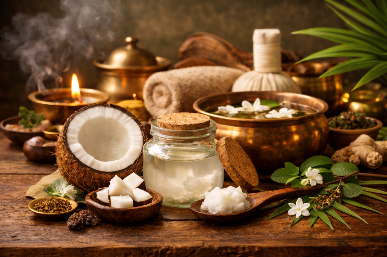 El aceite de coco es uno de los grandes aliados naturales dentro del Ayurveda gracias a sus propiedades nutritivas, calmantes y refrescantes.